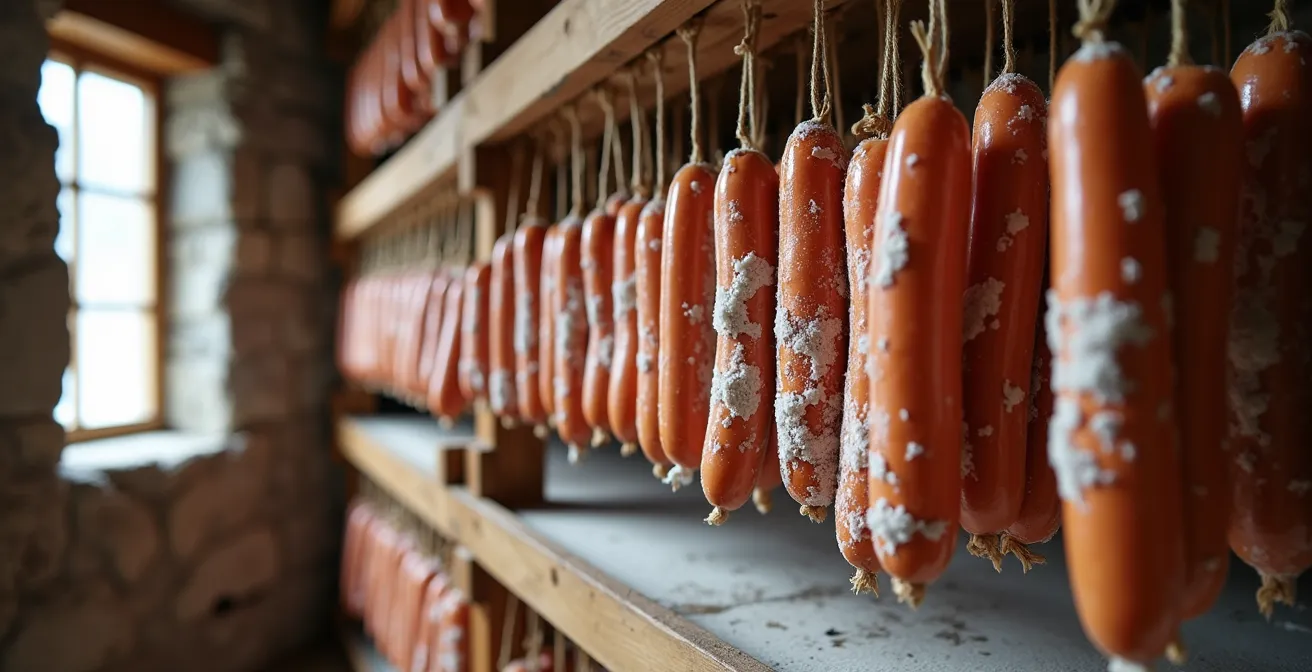 La véritable fleur, elle, est vivante. C’est un ensemble de moisissures nobles, principalement de la famille du Penicillium, le même genre qui nous a donné la pénicilline. Loin d’être décorative, cette flore joue un rôle biochimique crucial. Comme le détaillent des études sur le sujet, ces micro-organismes agissent comme un antibiotique naturel, protégeant le saucisson des bactéries indésirables. Ils régulent l’humidité, ralentissent l’oxydation et, surtout, participent activement à la création des arômes complexes du saucisson en dégradant les protéines et les lipides. C’est elle qui donne ces notes subtiles de champignon, de sous-bois et de cave humide.